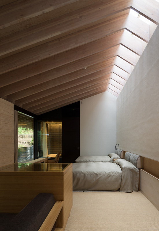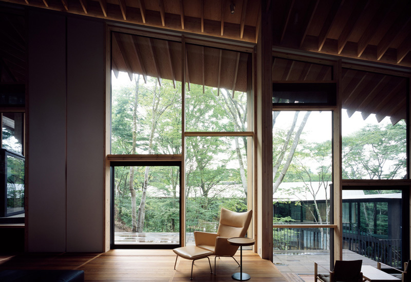 美しい広葉樹の林が広がる傾斜地に建てられた別荘です.敷地の流れに沿って生えていた大木を保存しつつ,それを中庭として緩やかに囲んだ配置になっています.